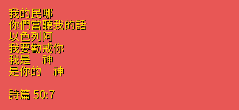 我的民哪、你們當聽我的話.以色列阿、我要勸戒你.我是 神、是你的 神。