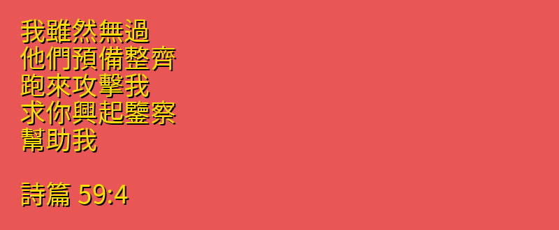 - 59:1 〔掃羅打發人窺探大衛的房屋、要殺他.那時大衛用這金詩、交與伶長、調用休要毀壞。〕我的 神阿、求你救我脫離仇敵、把我安置在高處、得脫那些起來攻擊我的人。