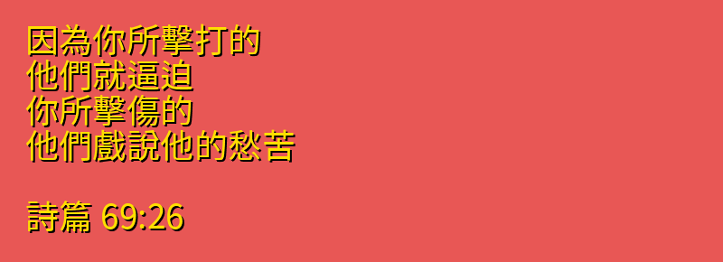 • 69:26 因為你所擊打的、他們就逼迫.你所擊傷的、他們戲說他的愁苦。