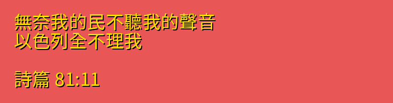 今日分享的中文聖經:「無奈我的民不聽我的聲音.以色列全不理我。」來自聖經「詩篇」第「81章11節」,你可以繼續向下拉看到聖經卷書完整章節。每日中文聖經從神的話語中聆聽神的聲音,引導我們的人生,指導我們人生的方向,讓我們做出正確的選擇,而做出這些正確選擇的原則都在聖經中,所以我們需要讀神的話語,認識他的話語,把神的話語藏在心裡。