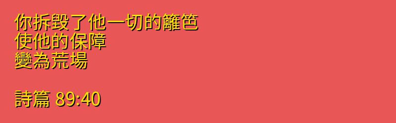 今日分享的中文聖經:「你拆毀了他一切的籬笆.使他的保障、變為荒場。」來自聖經「詩篇」第「89章40節」,你可以繼續向下拉看到聖經卷書完整章節。每日中文聖經從神的話語中聆聽神的聲音,引導我們的人生,指導我們人生的方向,讓我們做出正確的選擇,而做出這些正確選擇的原則都在聖經中,所以我們需要讀神的話語,認識他的話語,把神的話語藏在心裡。
