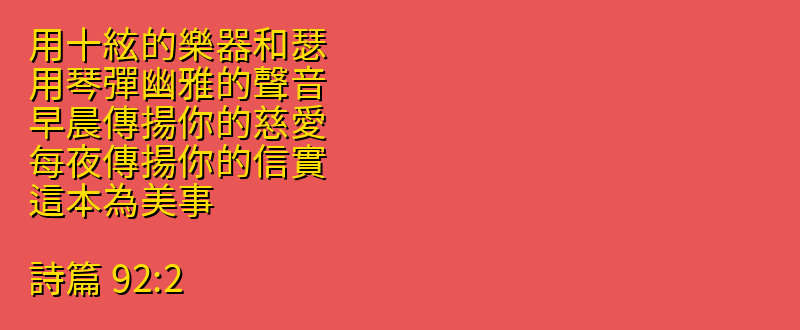 用十絃的樂器和瑟、用琴彈幽雅的聲音、早晨傳揚你的慈愛、每夜傳揚你的信實、這本為美事。
