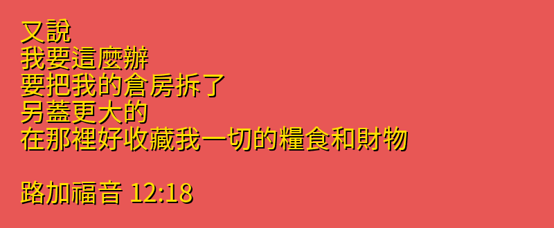 又說、我要這麼辦.要把我的倉房拆了、另蓋更大的.在那裡好收藏我一切的糧食和財物。