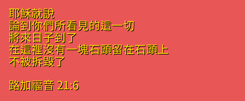 耶穌就說、論到你們所看見的這一切、將來日子到了、在這裡沒有一塊石頭留在石頭上、不被拆毀了。