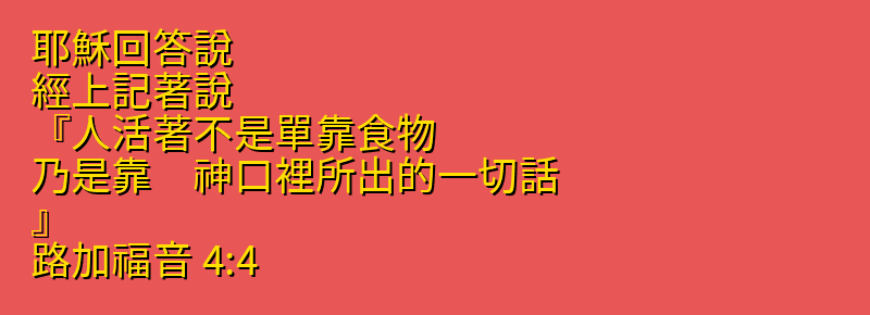 耶穌回答說、經上記著說、『人活著不是單靠食物、乃是靠 神口裡所出的一切話。』