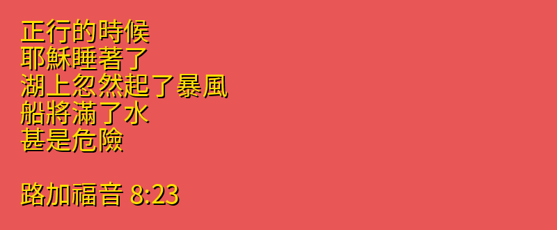 今日分享的中文聖經:「正行的時候、耶穌睡著了.湖上忽然起了暴風、船將滿了水、甚是危險。」來自聖經「路加福音」第「8章23節」,你可以繼續向下拉看到聖經卷書完整章節。每日中文聖經從神的話語中聆聽神的聲音,引導我們的人生,指導我們人生的方向,讓我們做出正確的選擇,而做出這些正確選擇的原則都在聖經中,所以我們需要讀神的話語,認識他的話語,把神的話語藏在心裡。