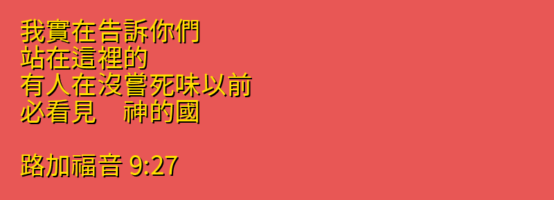 我實在告訴你們、站在這裡的、有人在沒嘗死味以前、必看見 神的國。