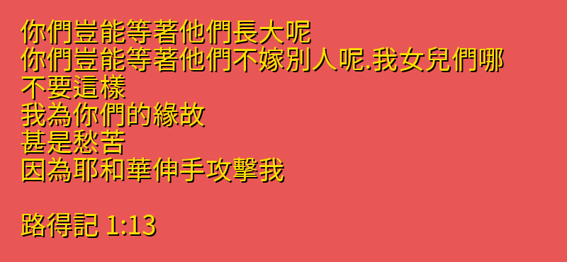你們豈能等著他們長大呢、你們豈能等著他們不嫁別人呢.我女兒們哪、不要這樣、我為你們的緣故、甚是愁苦、因為耶和華伸手攻擊我。