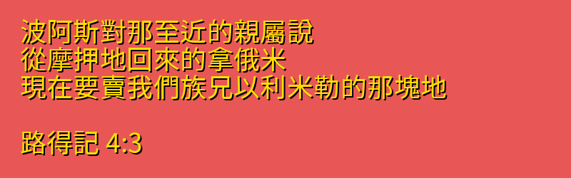今日分享的中文聖經:「波阿斯對那至近的親屬說、從摩押地回來的拿俄米、現在要賣我們族兄以利米勒的那塊地.」來自聖經「路得記」第「4章3節」,你可以繼續向下拉看到聖經卷書完整章節。每日中文聖經從神的話語中聆聽神的聲音,引導我們的人生,指導我們人生的方向,讓我們做出正確的選擇,而做出這些正確選擇的原則都在聖經中,所以我們需要讀神的話語,認識他的話語,把神的話語藏在心裡。