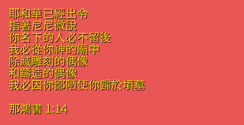 耶和華已經出令、指著尼尼微說、你名下的人必不留後.我必從你神的廟中、除滅雕刻的偶像、和鑄造的偶像.我必因你鄙陋使你歸於墳墓。