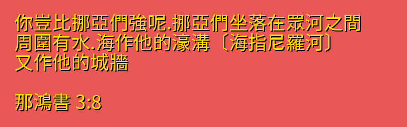 你豈比挪亞們強呢.挪亞們坐落在眾河之間、周圍有水.海作他的濠溝〔海指尼羅河〕又作他的城牆。