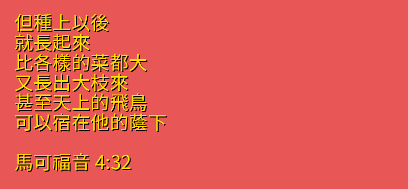 今日分享的中文聖經:「但種上以後、就長起來、比各樣的菜都大、又長出大枝來.甚至天上的飛鳥、可以宿在他的蔭下。」來自聖經「馬可福音」第「4章32節」,你可以繼續向下拉看到聖經卷書完整章節。每日中文聖經從神的話語中聆聽神的聲音,引導我們的人生,指導我們人生的方向,讓我們做出正確的選擇,而做出這些正確選擇的原則都在聖經中,所以我們需要讀神的話語,認識他的話語,把神的話語藏在心裡。