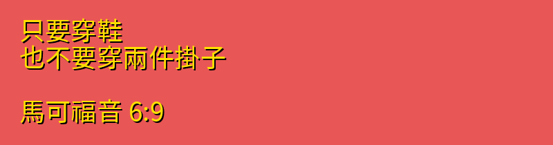 今日分享的中文聖經:「只要穿鞋.也不要穿兩件掛子。」來自聖經「馬可福音」第「6章9節」,你可以繼續向下拉看到聖經卷書完整章節。每日中文聖經從神的話語中聆聽神的聲音,引導我們的人生,指導我們人生的方向,讓我們做出正確的選擇,而做出這些正確選擇的原則都在聖經中,所以我們需要讀神的話語,認識他的話語,把神的話語藏在心裡。