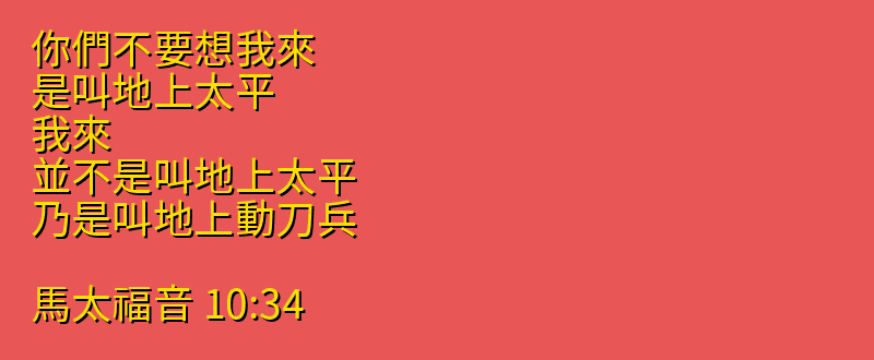 你們不要想我來、是叫地上太平.我來、並不是叫地上太平、乃是叫地上動刀兵。
