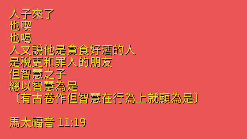 人子來了、也喫、也喝、人又說他是貪食好酒的人、是稅吏和罪人的朋友.但智慧之子、總以智慧為是。〔有古卷作但智慧在行為上就顯為是〕