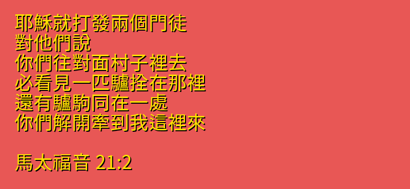 今日分享的中文聖經:「耶穌就打發兩個門徒、對他們說、你們往對面村子裡去、必看見一匹驢拴在那裡、還有驢駒同在一處.你們解開牽到我這裡來。」來自聖經「馬太福音」第「21章2節」,你可以繼續向下拉看到聖經卷書完整章節。每日中文聖經從神的話語中聆聽神的聲音,引導我們的人生,指導我們人生的方向,讓我們做出正確的選擇,而做出這些正確選擇的原則都在聖經中,所以我們需要讀神的話語,認識他的話語,把神的話語藏在心裡。