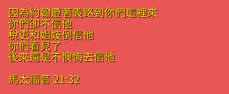 因為約翰遵著義路到你們這裡來、你們卻不信他.稅吏和娼妓倒信他。你們看見了、後來還是不懊悔去信他。