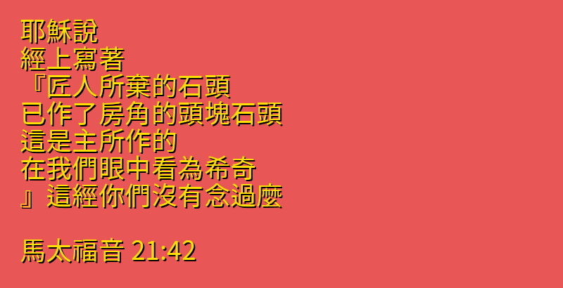 耶穌說、經上寫著、『匠人所棄的石頭、已作了房角的頭塊石頭.這是主所作的、在我們眼中看為希奇。』這經你們沒有念過麼。