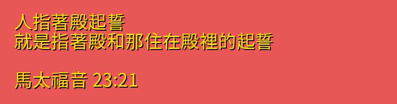 • 23:20 所以人指著壇起誓、就是指著壇和壇上一切所有的起誓。