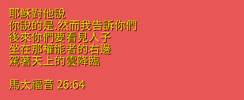 耶穌對他說、你說的是.然而我告訴你們、後來你們要看見人子、坐在那權能者的右邊、駕著天上的雲降臨。