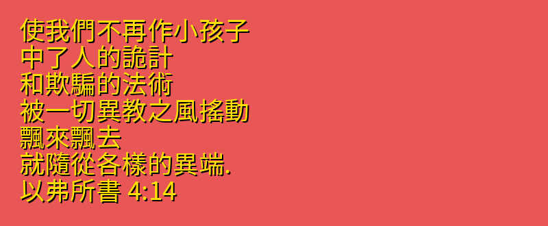 使我們不再作小孩子、中了人的詭計、和欺騙的法術、被一切異教之風搖動、飄來飄去、就隨從各樣的異端.
