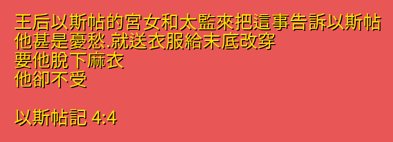 王后以斯帖的宮女和太監來把這事告訴以斯帖、他甚是憂愁.就送衣服給末底改穿、要他脫下麻衣、他卻不受。