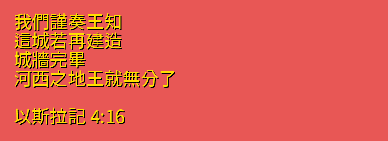 今日分享的中文聖經:「我們謹奏王知、這城若再建造、城牆完畢、河西之地王就無分了。」來自聖經「以斯拉記」第「4章16節」,你可以繼續向下拉看到聖經卷書完整章節。每日中文聖經從神的話語中聆聽神的聲音,引導我們的人生,指導我們人生的方向,讓我們做出正確的選擇,而做出這些正確選擇的原則都在聖經中,所以我們需要讀神的話語,認識他的話語,把神的話語藏在心裡。