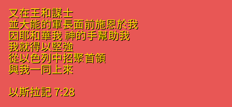 • 7:28 又在王和謀士、並大能的軍長面前施恩於我。因耶和華我 神的手幫助我、我就得以堅強、從以色列中招聚首領、與我一同上來。