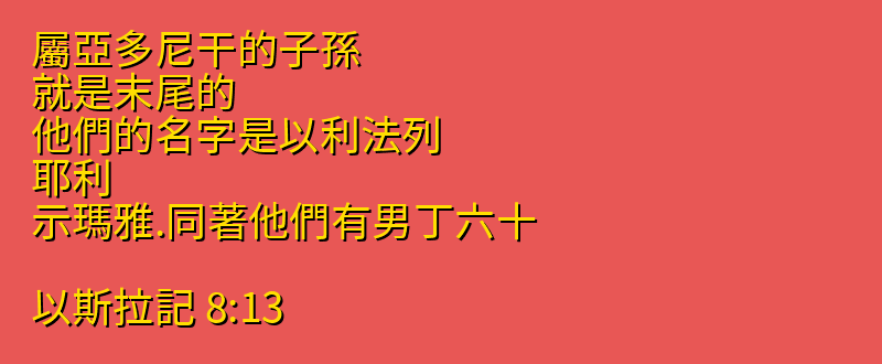 今日分享的中文聖經:「屬亞多尼干的子孫、就是末尾的、他們的名字是以利法列、耶利、示瑪雅.同著他們有男丁六十。」來自聖經「以斯拉記」第「8章13節」,你可以繼續向下拉看到聖經卷書完整章節。每日中文聖經從神的話語中聆聽神的聲音,引導我們的人生,指導我們人生的方向,讓我們做出正確的選擇,而做出這些正確選擇的原則都在聖經中,所以我們需要讀神的話語,認識他的話語,把神的話語藏在心裡。