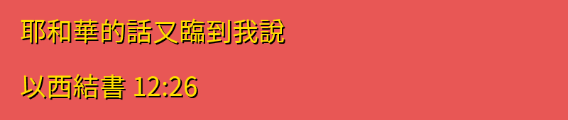 今日分享的中文聖經:「耶和華的話又臨到我說、」來自聖經「以西結書」第「12章26節」,你可以繼續向下拉看到聖經卷書完整章節。每日中文聖經從神的話語中聆聽神的聲音,引導我們的人生,指導我們人生的方向,讓我們做出正確的選擇,而做出這些正確選擇的原則都在聖經中,所以我們需要讀神的話語,認識他的話語,把神的話語藏在心裡。