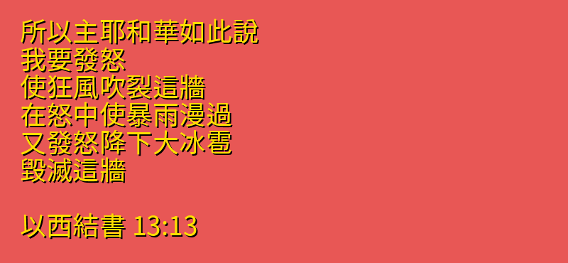所以主耶和華如此說、我要發怒、使狂風吹裂這牆、在怒中使暴雨漫過、又發怒降下大冰雹、毀滅這牆。