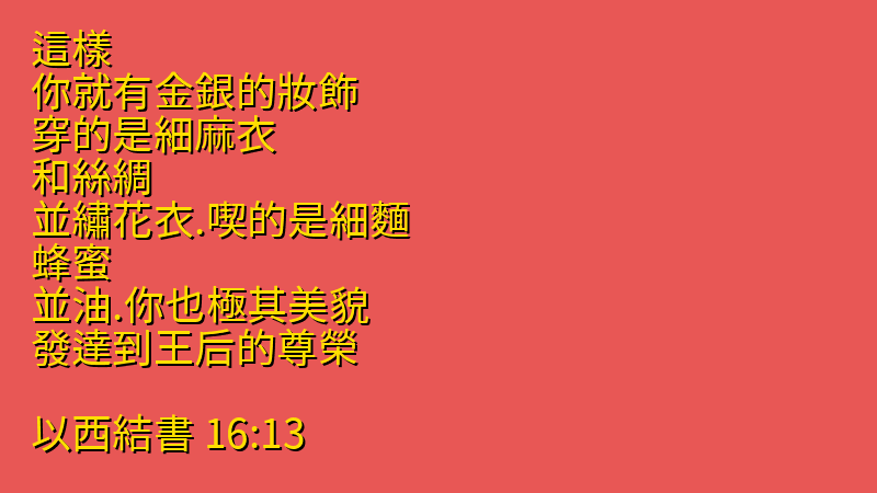 • 16:13 這樣、你就有金銀的妝飾、穿的是細麻衣、和絲綢、並繡花衣.喫的是細麵、蜂蜜、並油.你也極其美貌、發達到王后的尊榮。