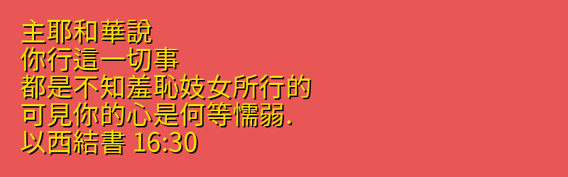 • 16:30 主耶和華說、你行這一切事、都是不知羞恥妓女所行的、可見你的心是何等懦弱.