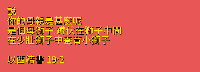 • 19:2 說、你的母親是甚麼呢、是個母獅子.蹲伏在獅子中間、在少壯獅子中養育小獅子。