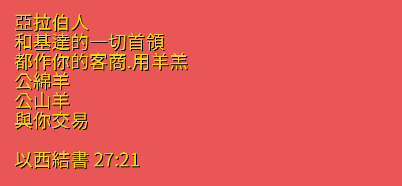 今日分享的中文聖經:「亞拉伯人、和基達的一切首領、都作你的客商.用羊羔、公綿羊、公山羊、與你交易。」來自聖經「以西結書」第「27章21節」,你可以繼續向下拉看到聖經卷書完整章節。每日中文聖經從神的話語中聆聽神的聲音,引導我們的人生,指導我們人生的方向,讓我們做出正確的選擇,而做出這些正確選擇的原則都在聖經中,所以我們需要讀神的話語,認識他的話語,把神的話語藏在心裡。