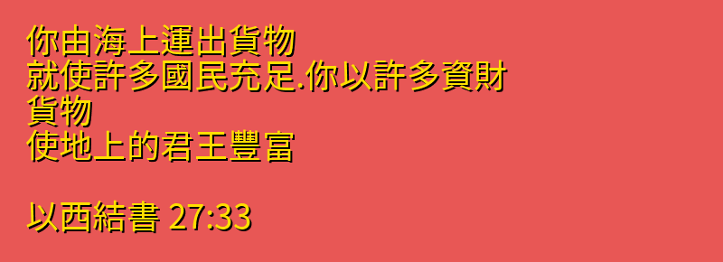 你由海上運出貨物、就使許多國民充足.你以許多資財、貨物、使地上的君王豐富。