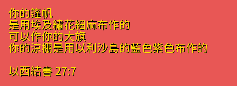 你的篷帆、是用埃及繡花細麻布作的、可以作你的大旗、你的涼棚是用以利沙島的藍色紫色布作的。