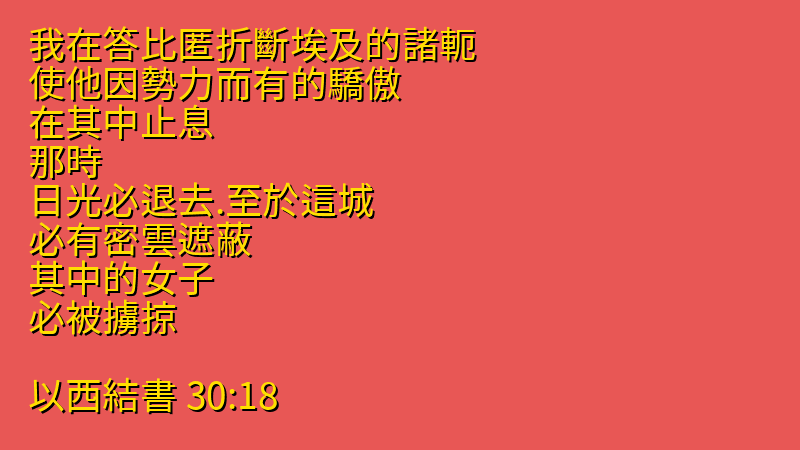 我在答比匿折斷埃及的諸軛、使他因勢力而有的驕傲、在其中止息、那時、日光必退去.至於這城、必有密雲遮蔽、其中的女子、必被擄掠。