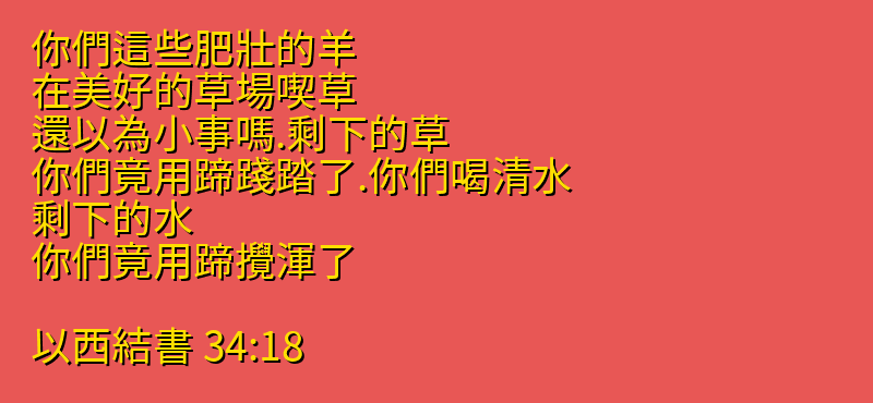 你們這些肥壯的羊、在美好的草場喫草、還以為小事嗎.剩下的草、你們竟用蹄踐踏了.你們喝清水、剩下的水、你們竟用蹄攪渾了。