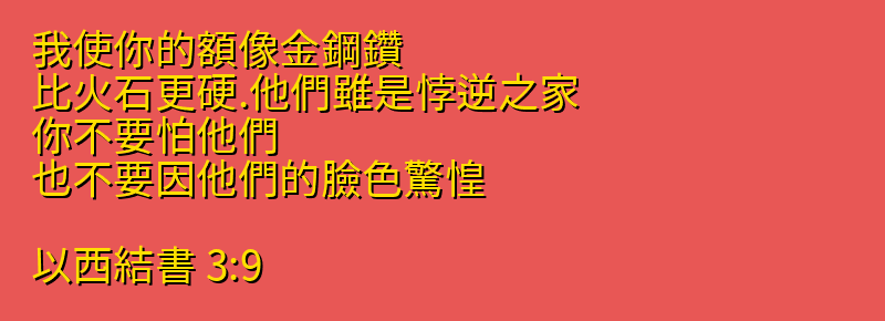 我使你的額像金鋼鑽、比火石更硬.他們雖是悖逆之家、你不要怕他們、也不要因他們的臉色驚惶。