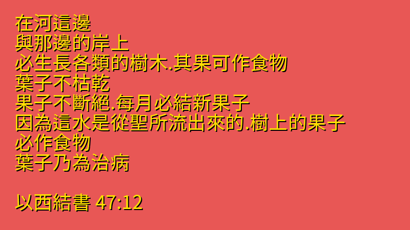 在河這邊、與那邊的岸上、必生長各類的樹木.其果可作食物、葉子不枯乾、果子不斷絕.每月必結新果子、因為這水是從聖所流出來的.樹上的果子、必作食物、葉子乃為治病。