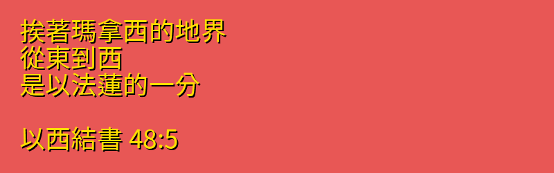 今日分享的中文聖經:「挨著瑪拿西的地界、從東到西、是以法蓮的一分。」來自聖經「以西結書」第「48章5節」,你可以繼續向下拉看到聖經卷書完整章節。每日中文聖經從神的話語中聆聽神的聲音,引導我們的人生,指導我們人生的方向,讓我們做出正確的選擇,而做出這些正確選擇的原則都在聖經中,所以我們需要讀神的話語,認識他的話語,把神的話語藏在心裡。