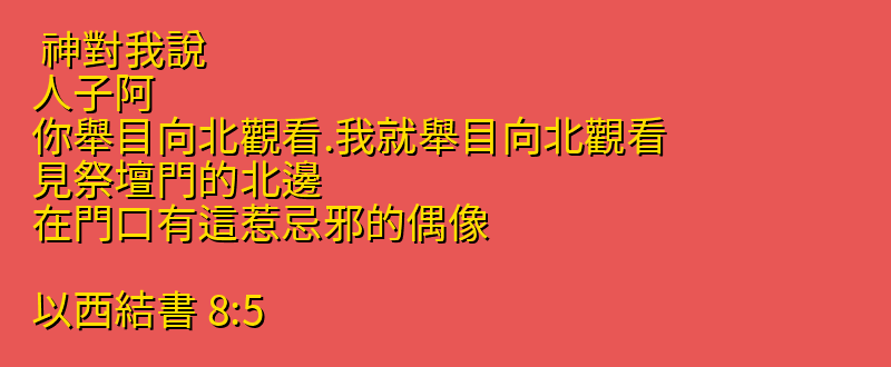 神對我說、人子阿、你舉目向北觀看.我就舉目向北觀看、見祭壇門的北邊、在門口有這惹忌邪的偶像。