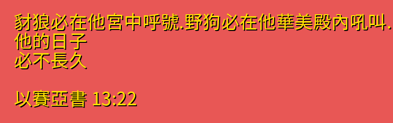 豺狼必在他宮中呼號.野狗必在他華美殿內吼叫.巴比倫受罰的時候臨近、他的日子、必不長久。