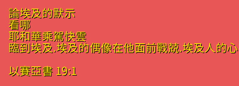 - 19:1 論埃及的默示。看哪、耶和華乘駕快雲、臨到埃及.埃及的偶像在他面前戰兢.埃及人的心在裡面消化。