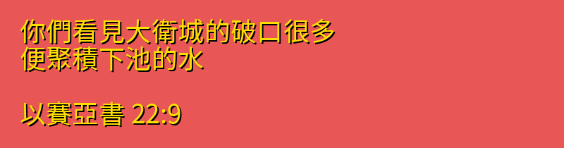 今日分享的中文聖經:「你們看見大衛城的破口很多、便聚積下池的水。」來自聖經「以賽亞書」第「22章9節」,你可以繼續向下拉看到聖經卷書完整章節。每日中文聖經從神的話語中聆聽神的聲音,引導我們的人生,指導我們人生的方向,讓我們做出正確的選擇,而做出這些正確選擇的原則都在聖經中,所以我們需要讀神的話語,認識他的話語,把神的話語藏在心裡。