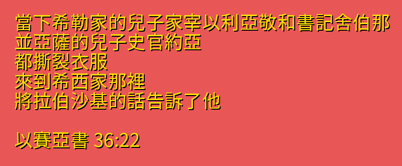 聖經當下希勒家的兒子家宰以利亞敬和書記舍伯那、並亞薩的兒子史官約亞、都撕裂衣服、來到希西家那裡、將拉伯沙基的話告訴了他。 2025年12月推介聖經優惠