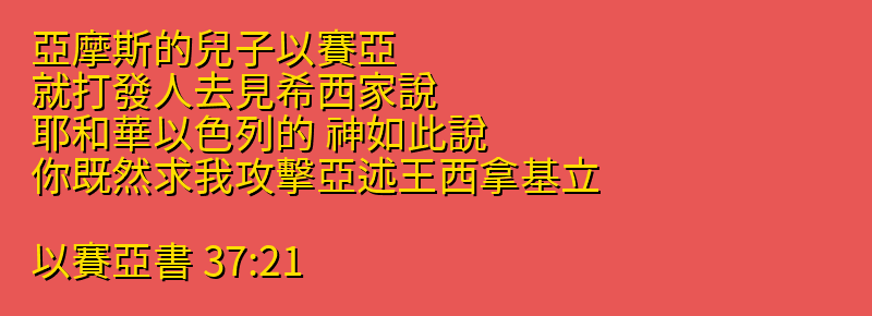 亞摩斯的兒子以賽亞、就打發人去見希西家說、耶和華以色列的 神如此說、你既然求我攻擊亞述王西拿基立、