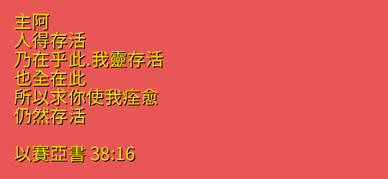 今日分享的中文聖經:「主阿、人得存活、乃在乎此.我靈存活、也全在此。所以求你使我痊愈、仍然存活。」來自聖經「以賽亞書」第「38章16節」,你可以繼續向下拉看到聖經卷書完整章節。每日中文聖經從神的話語中聆聽神的聲音,引導我們的人生,指導我們人生的方向,讓我們做出正確的選擇,而做出這些正確選擇的原則都在聖經中,所以我們需要讀神的話語,認識他的話語,把神的話語藏在心裡。