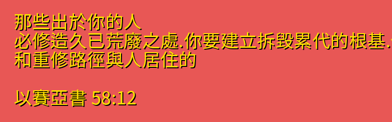 那些出於你的人、必修造久已荒廢之處.你要建立拆毀累代的根基.你必稱為補破口的、和重修路徑與人居住的。